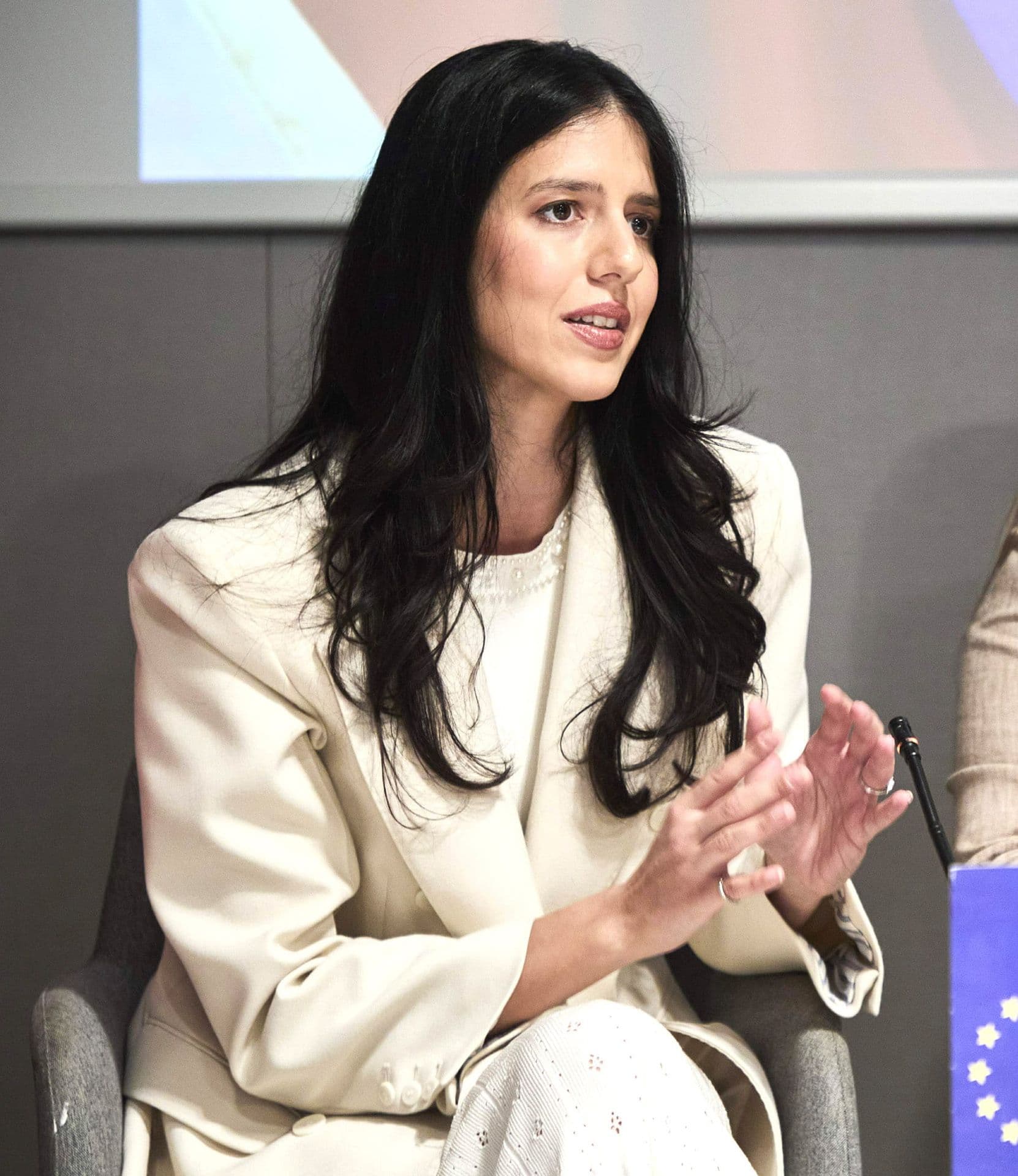 Next in line, Jelena Grdinić makes an impression with a pleasant pastel shade of apricot, a rarity in business attire. This color demands precise structuring in the suit’s design, which she successfully achieves. While the focus remains on her suit, the brooch, in a contrasting palette, stands out as an accessory. However, the choice of blouse color could have differed to elevate the overall look; despite this, her outfit holds a strong position due to its foundational piece that radiates elegance.