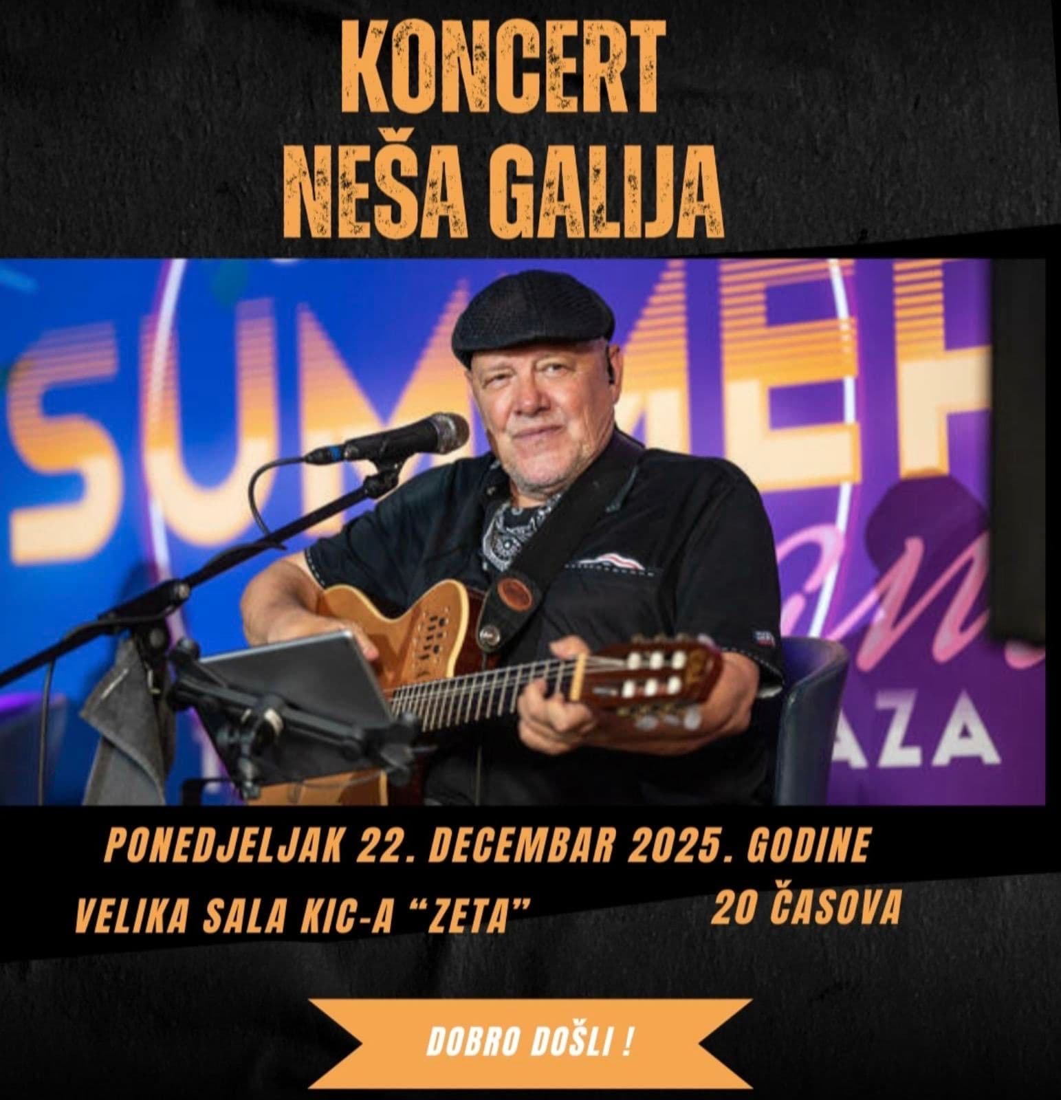 Renowned singer-songwriter Neša Galija is set to perform at the large hall of KIC Zeta on December 22. The concert will kick off at 20:00 local time, promising an evening filled with emotion, poignant lyrics, and the distinctive musical expression of one of the region’s most respected artists.