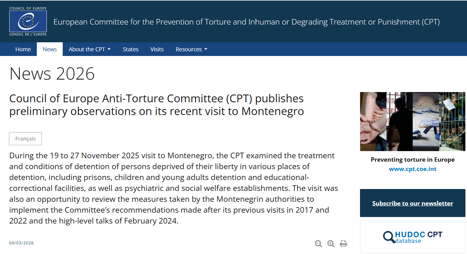 On January 22, 2026, Montenegrin authorities responded to various inquiries raised by the CPT delegation during their visit. The complete report detailing the findings from the November 2022 visit will be submitted to the Montenegrin government in July 2026.